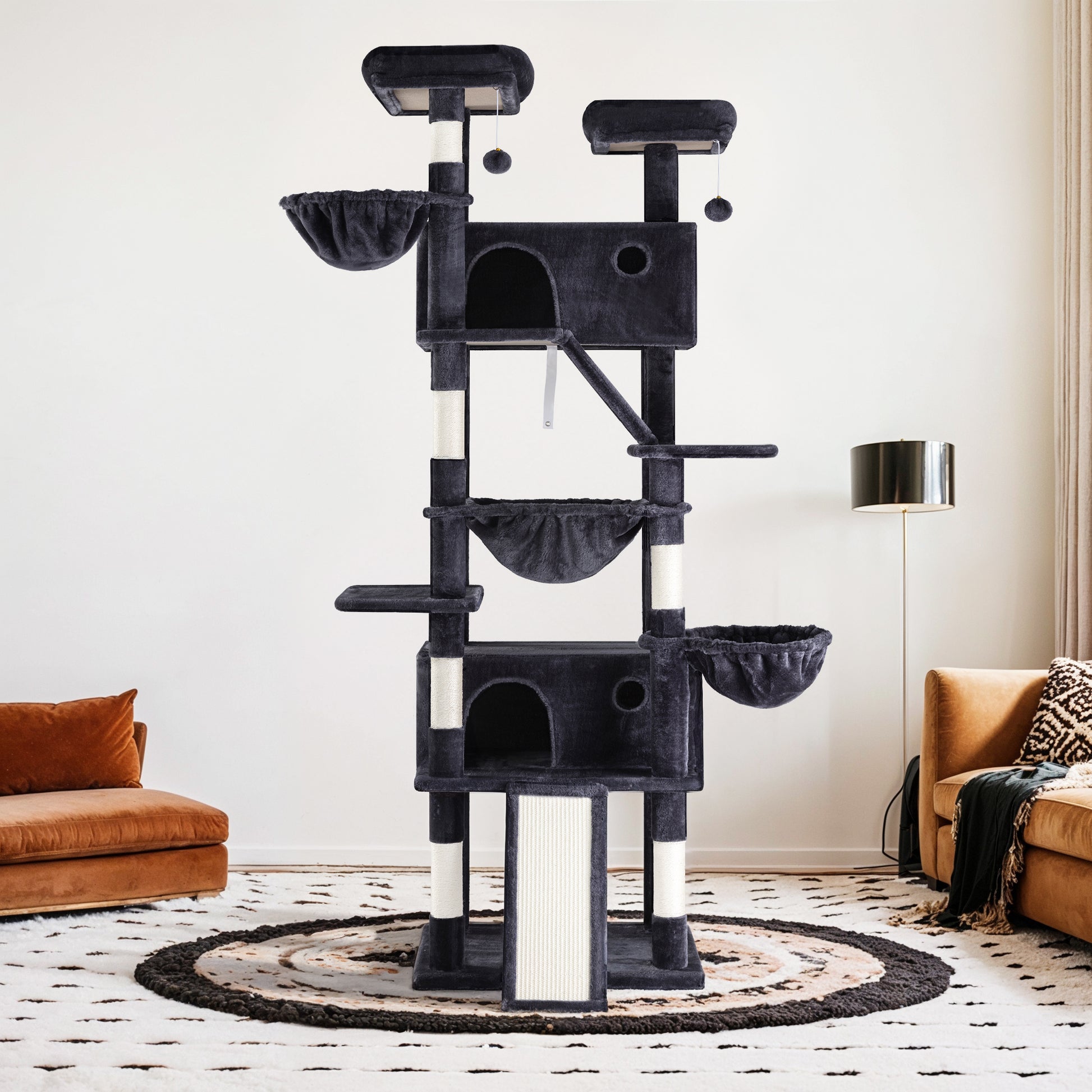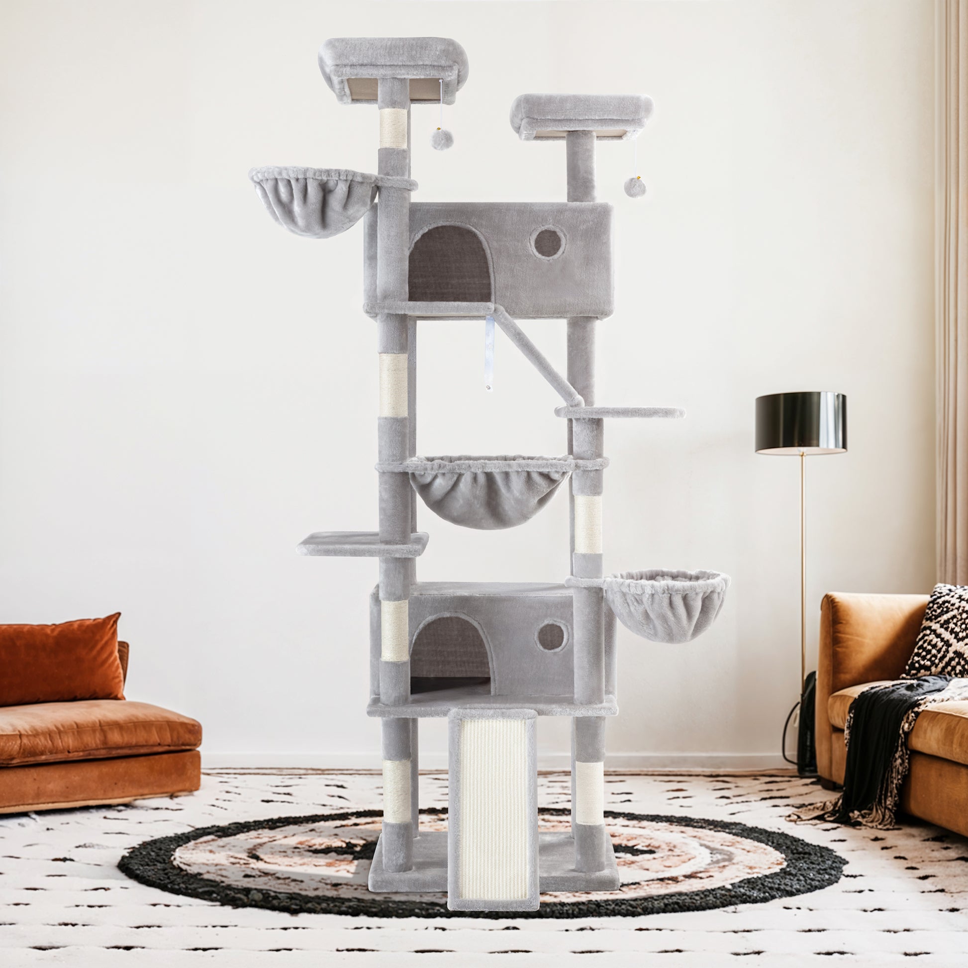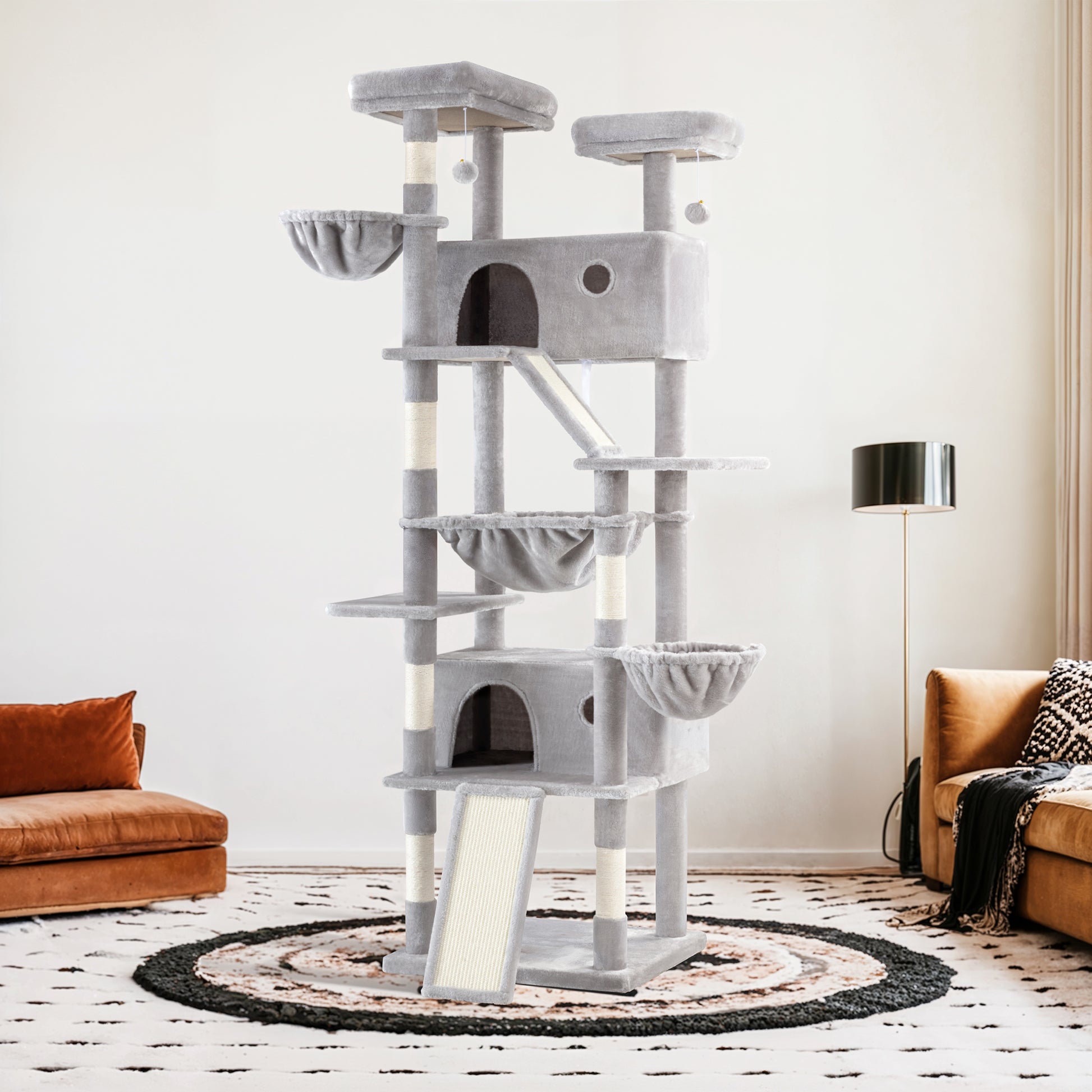 - Durable Scratching Surfaces: Equipped with a sisal scratching ramp and a sisal-wrapped scratching post, this tower promotes healthy scratching behavior while protecting your furniture from damage. The natural sisal fibers help keep your cat's claws sharp and strong.