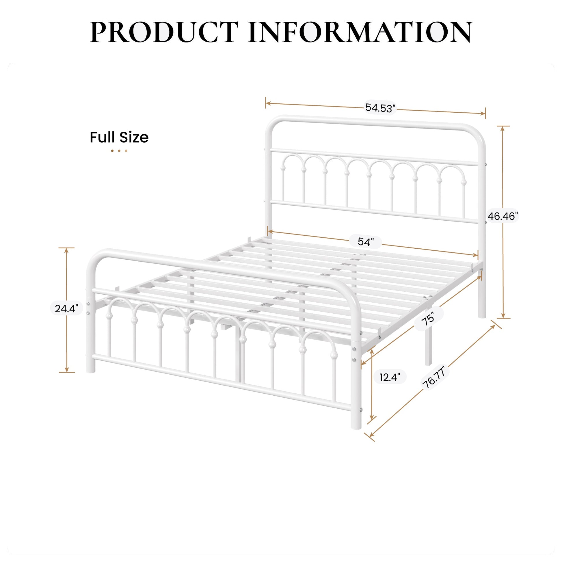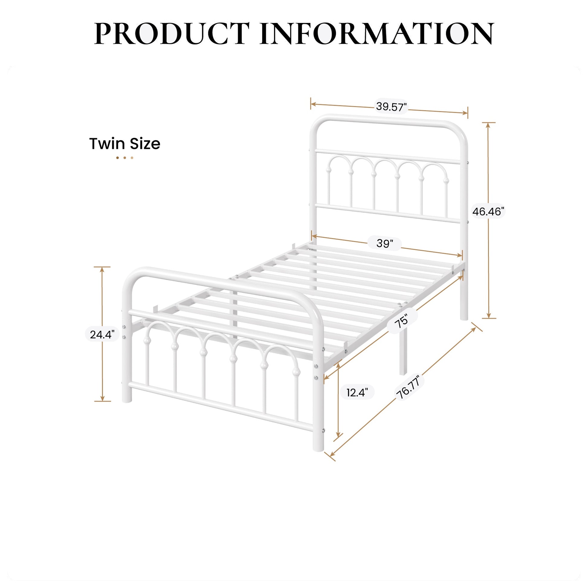 Discover the perfect blend of vintage charm and modern function with our sturdy steel platform bed frame. The elegantly curved iron-art headboard adds a refined retro touch, featuring smooth, flowing lines for both beauty and peace of mind. With 12.4" of extra storage space underneath, easily store seasonal items and keep your bedroom clutter-free. Four mattress retainers—two on each side, reinforced with premium screws—keep your mattress from shifting. Designed to support 8-12” mattresses (no box spring required), this robust frame assembles effortlessly in under 30 minutes.