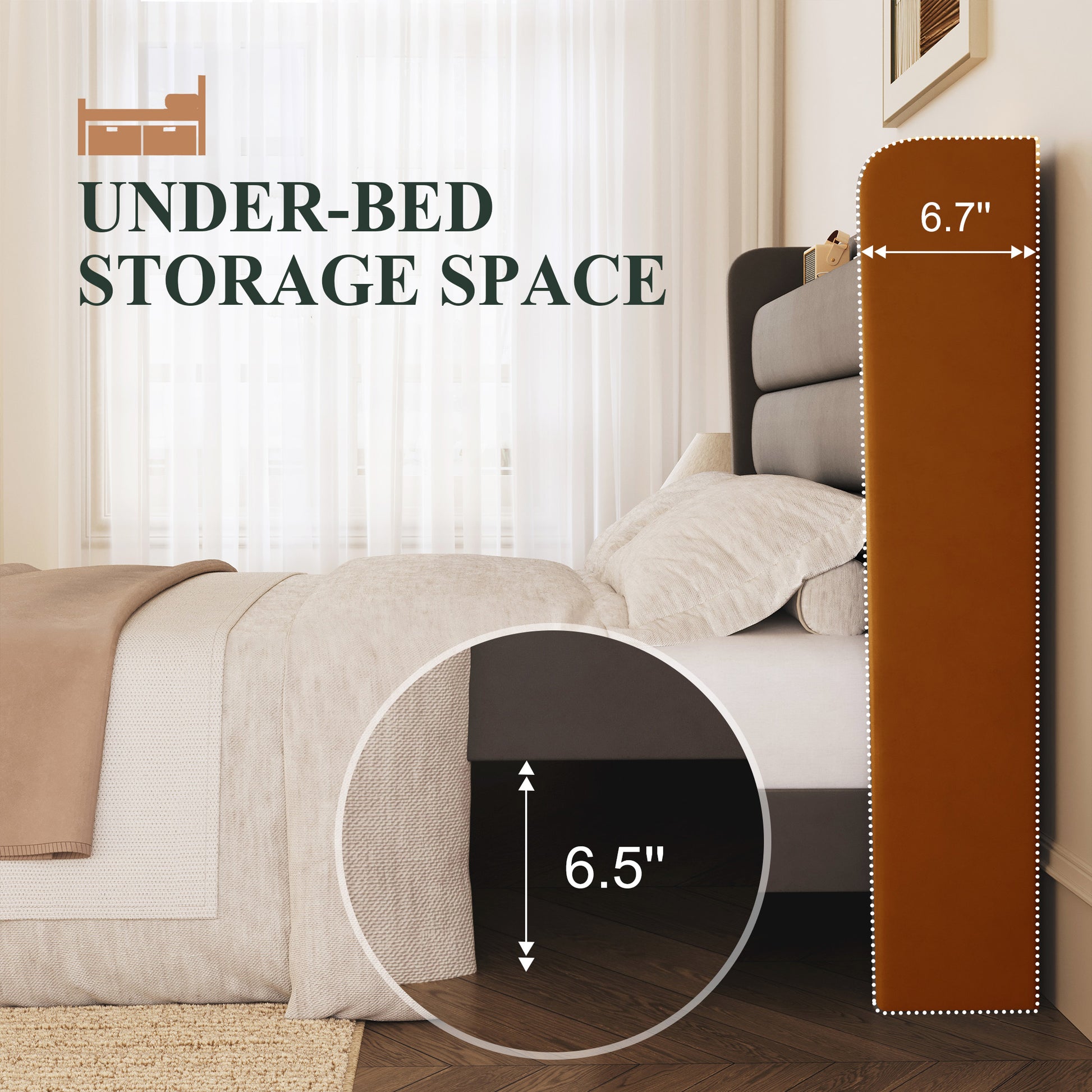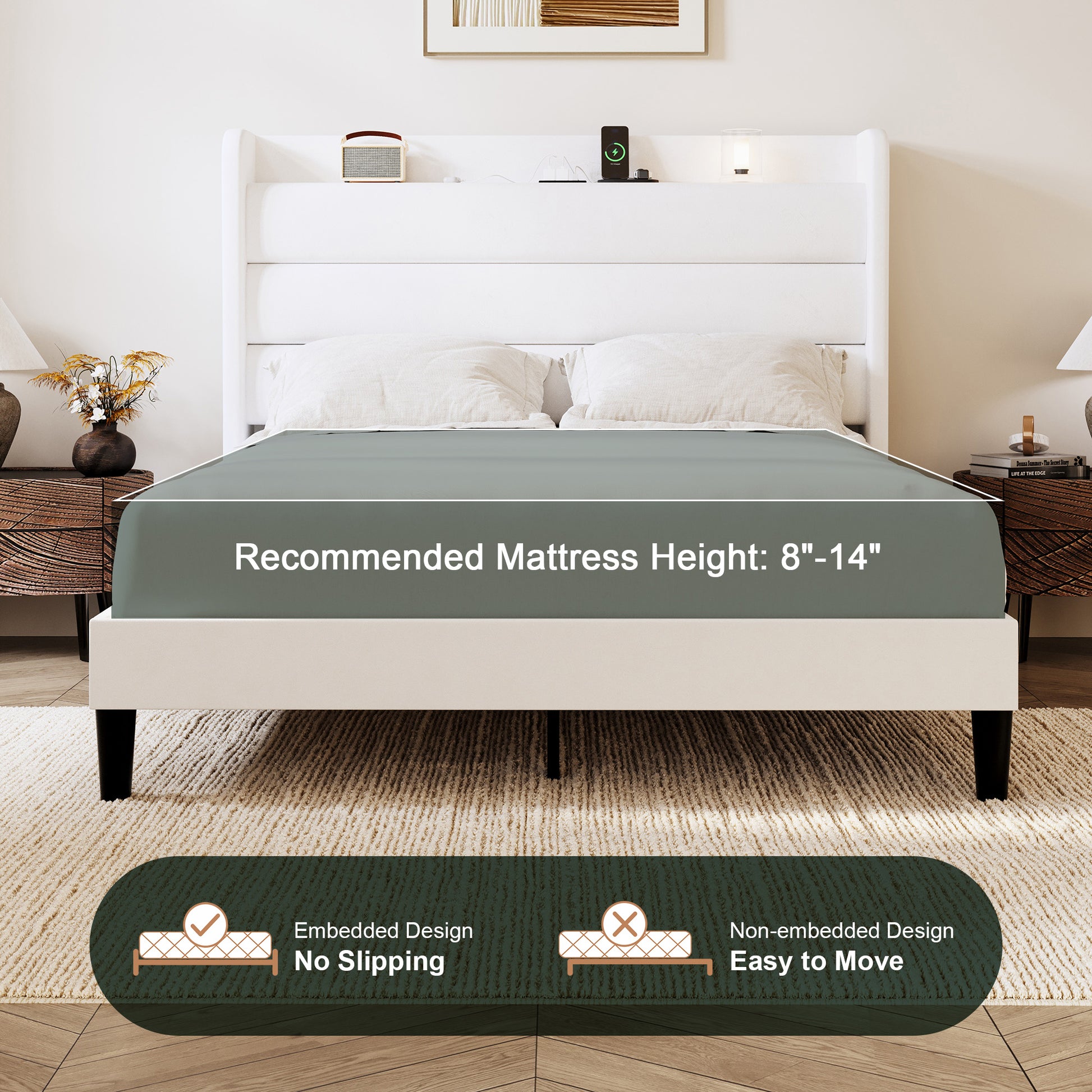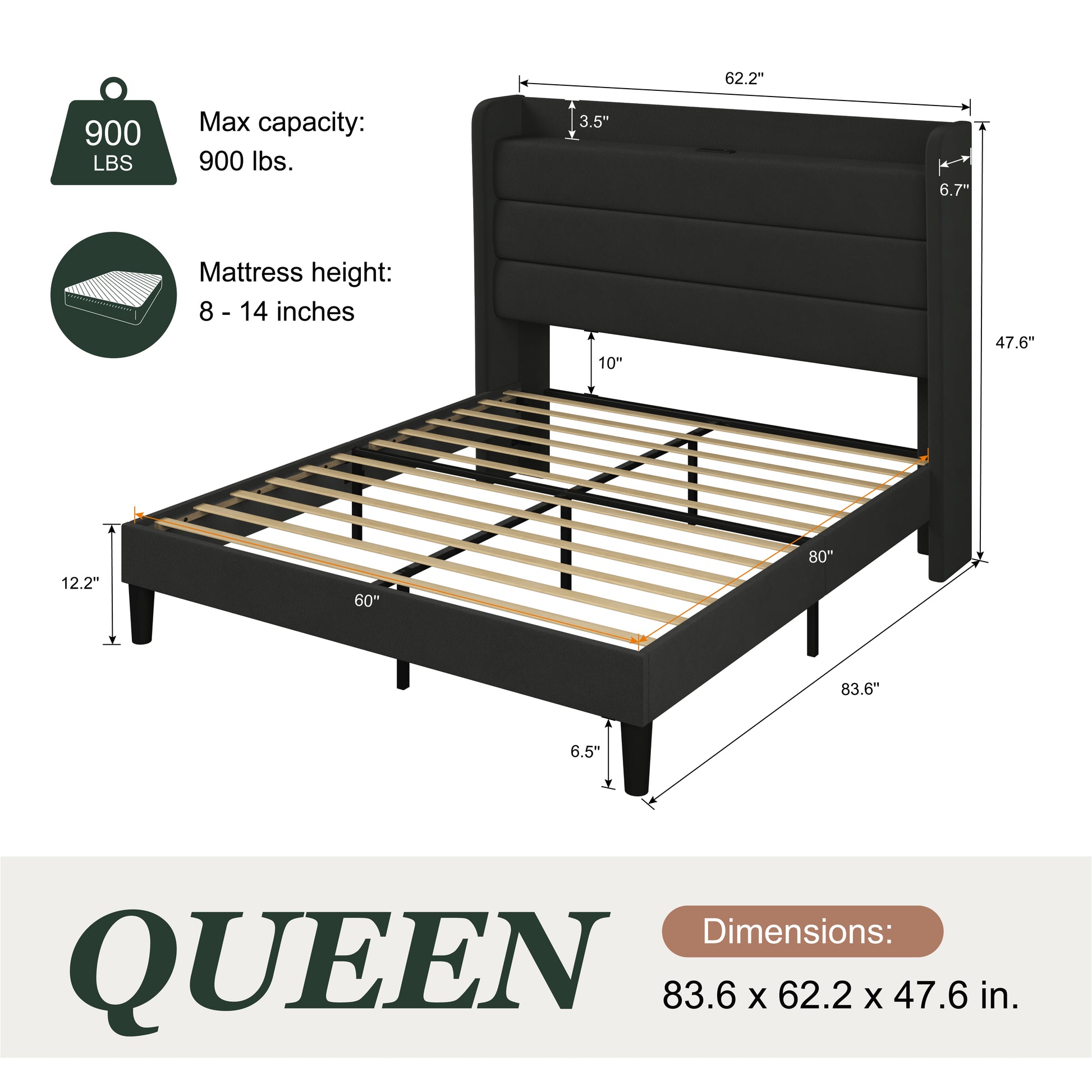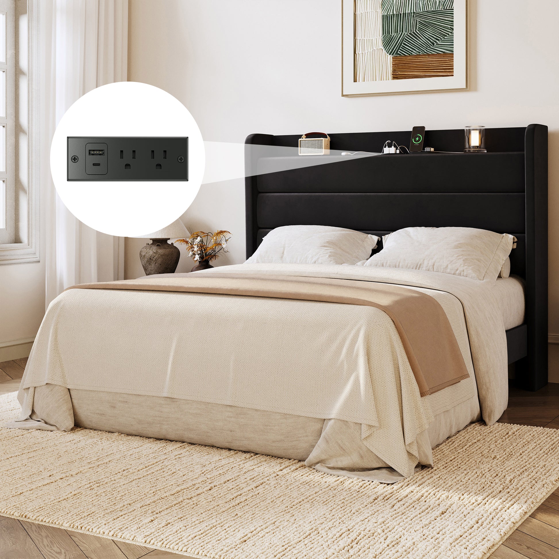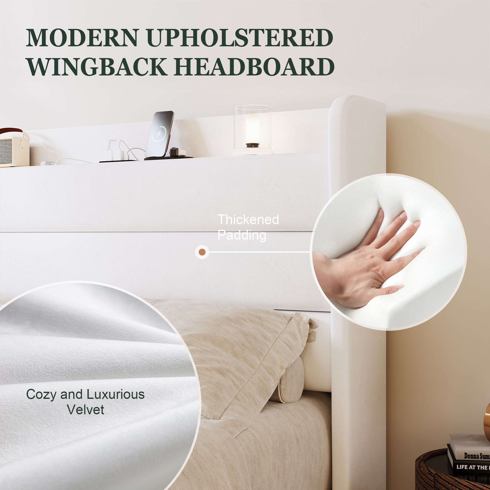 Amolife Platform Bed Frame with Upholstered Velvet Wingback Slat Headboard & Built-In Charging Station