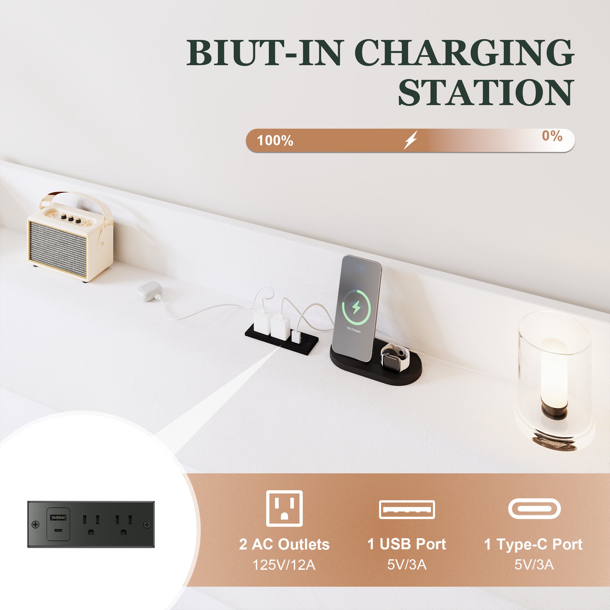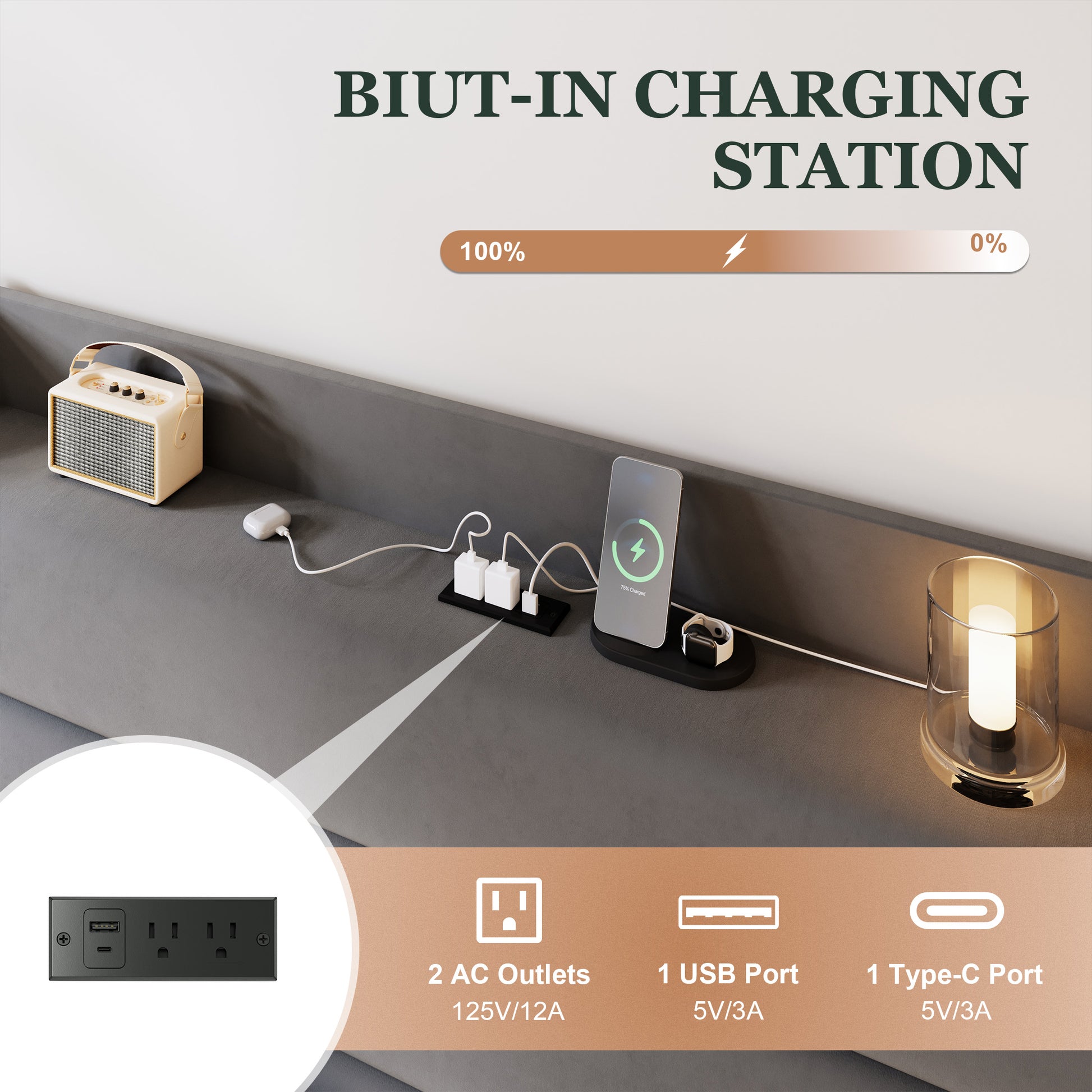 - Built-in Charging Station: Stay connected while you rest with USB charging ports and outlet conveniently placed on the headboard. Charge your phone, tablet, or other devices overnight without needing extra outlets or messy cables. This thoughtful design ensures easy access to power, keeping your essentials within reach and your bedside clutter-free.
