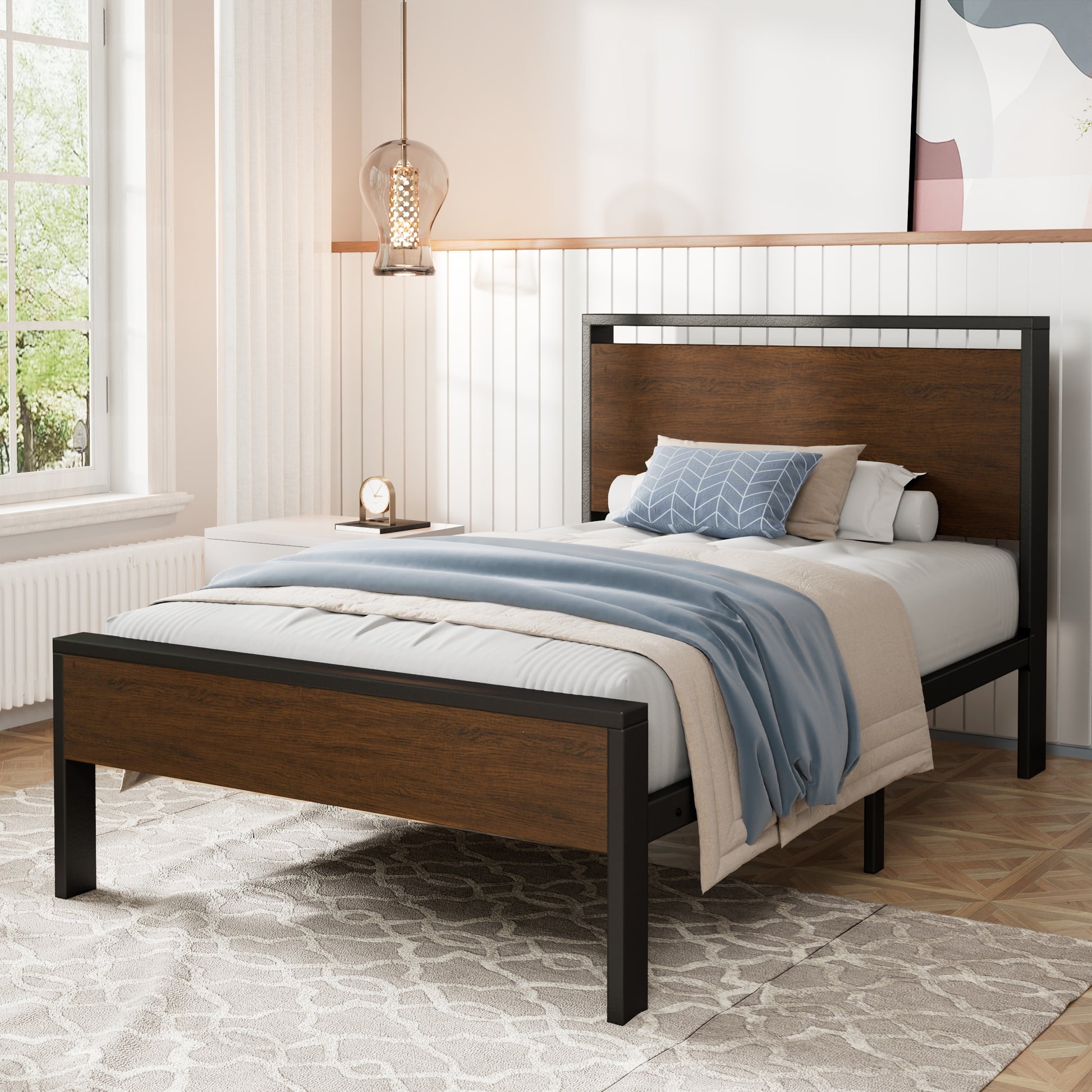 Amolife Twin Size Bed Frame, Heavy Duty Metal Platform Bed with Wooden Headboard & Footboard, No Box Spring Needed