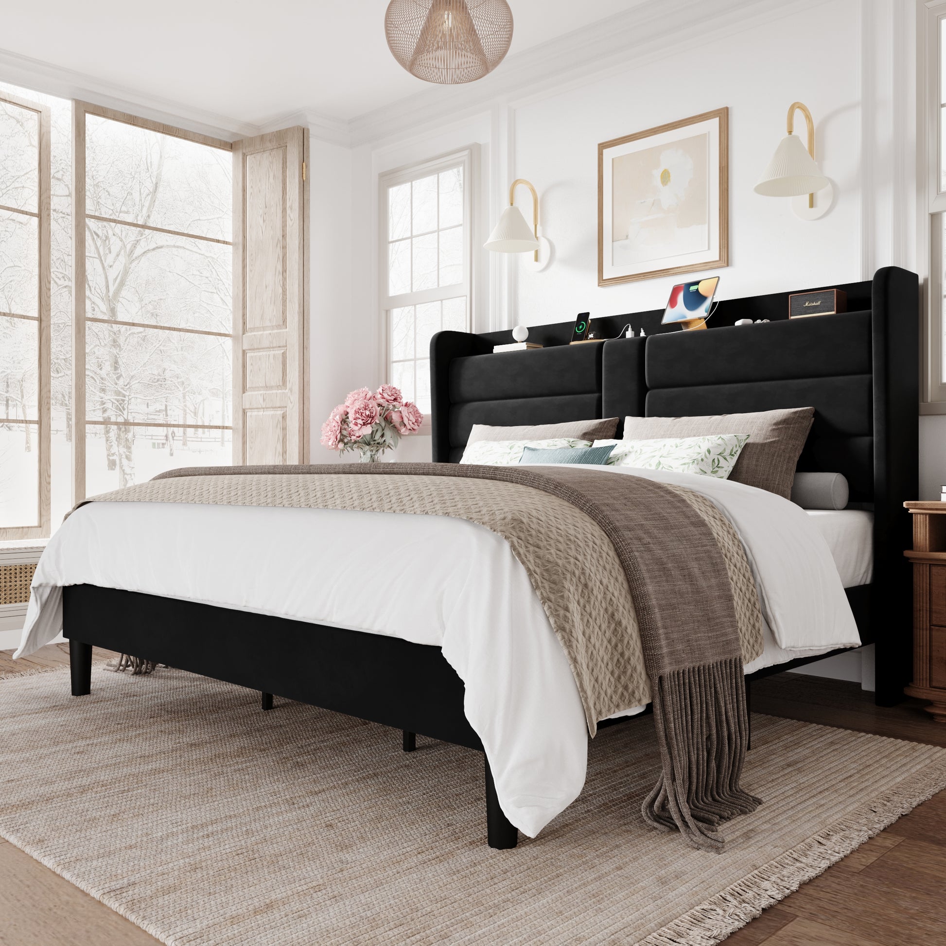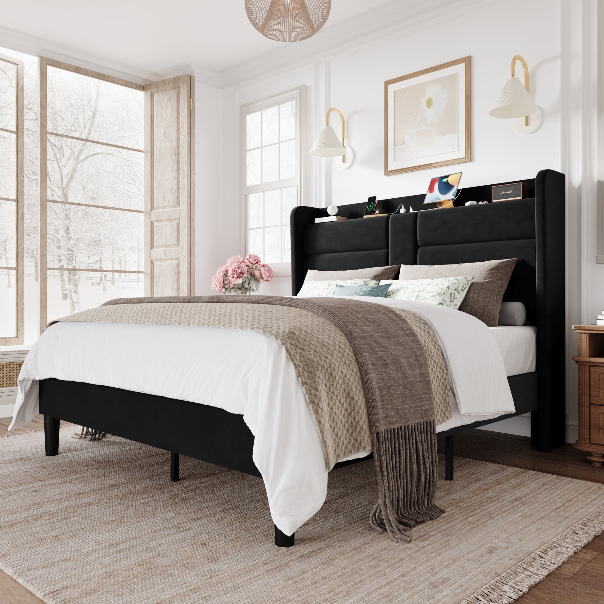 Amolife Upholstered Platform Bed Frame with Velvet Wingback Headboard & USB Charging Ports, No Box Spring Needed