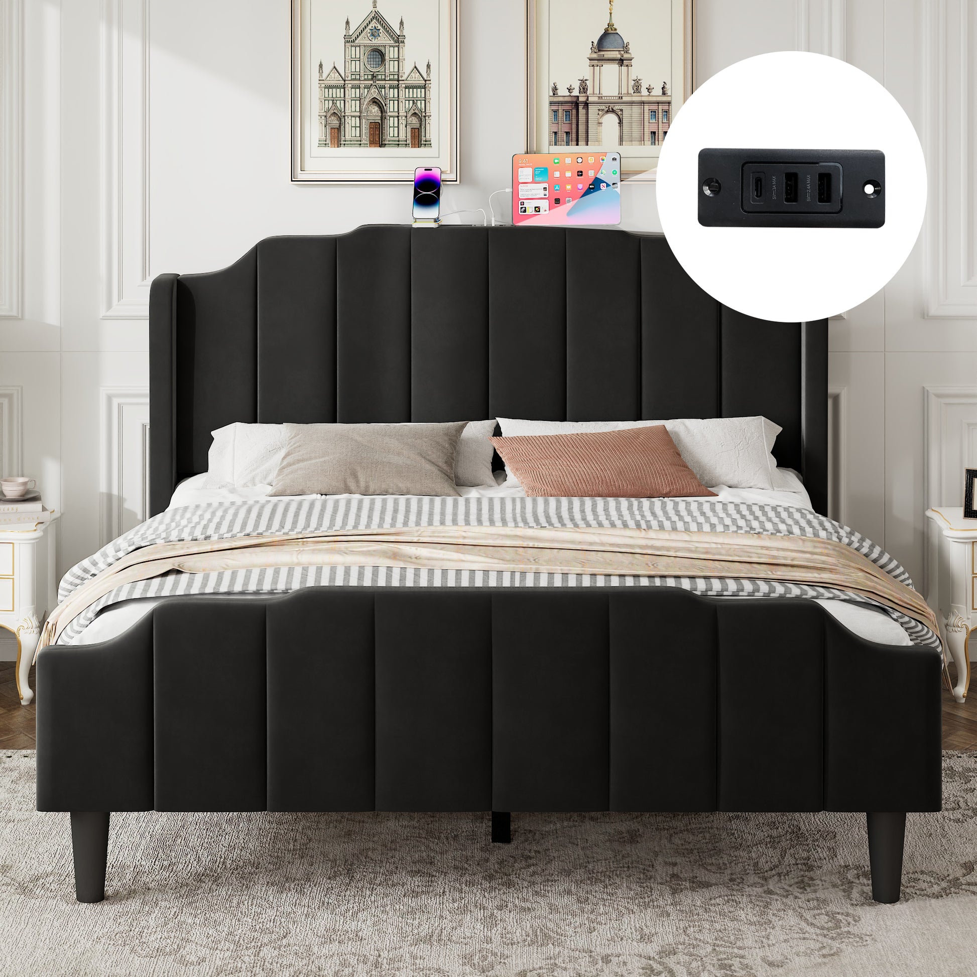 Amolife Upholstered Platform Bed with with USB Ports & Curved Velvet Wingback Headboard