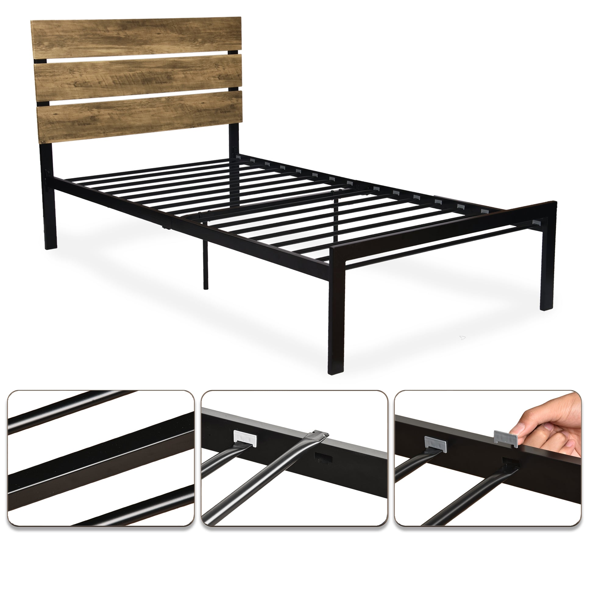 Twin Size Platform Bed Frame with Wood Headboard, Rustic Country Style, Black Powder Coating, Light Brown