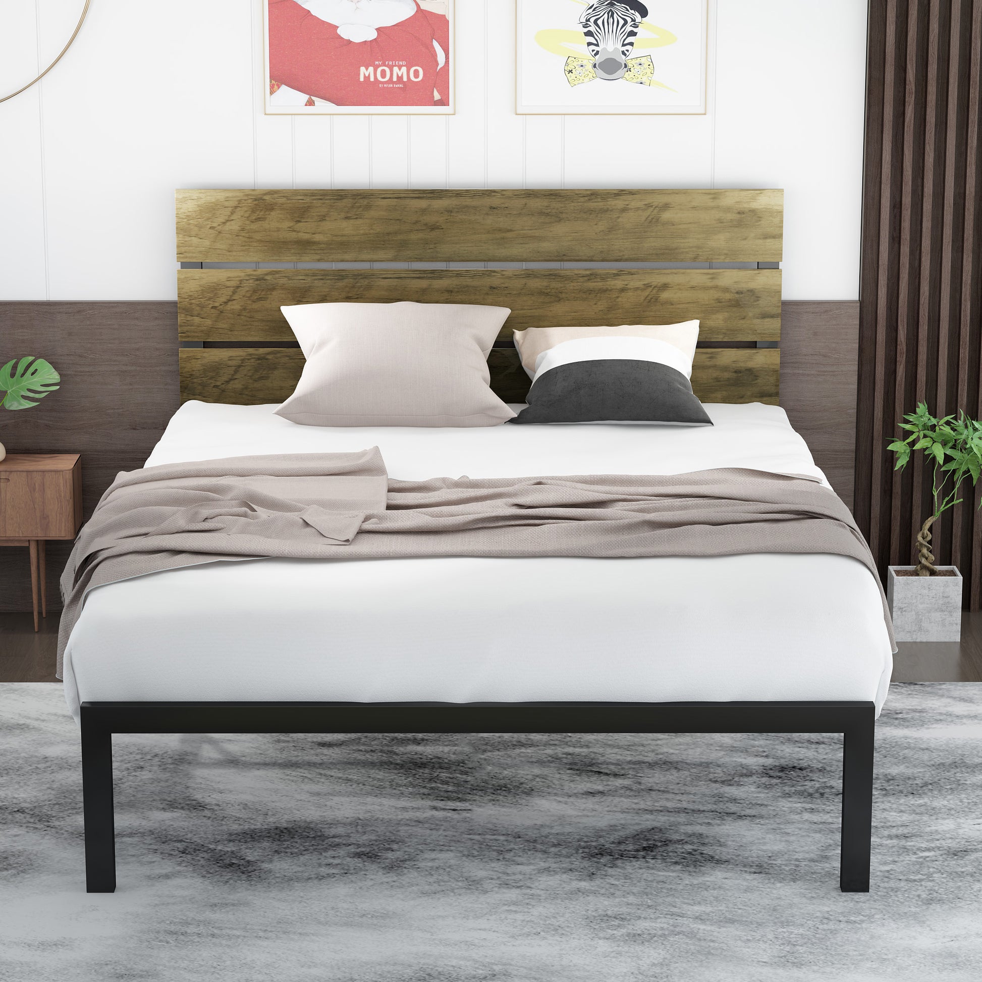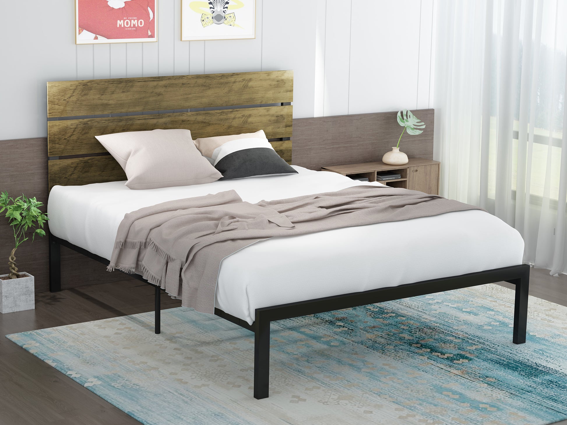 This Amolife Industrial Platform Bed Frame features a rustic finish headboard and black powder-coated metal frame. Strong metal slats support provides great stability and durability. Durable and fashionable black powder coating surface keeps away from rust and scratches. Have you ever worried about the creaking noise of bed? This bed frame will never make a noise like that, it was equipped with side rubber strip, preventing metal friction and giving a sound sleep all night.